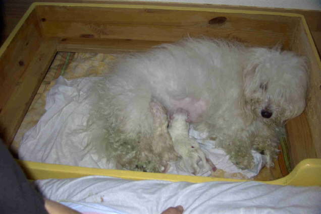 ... wenn auch ziemlich geschafft.Cocos Fell ist durch Fruchtwasserund Blut ganz grün , nach einem kurzen Bad war sie schnell wieder sauber.