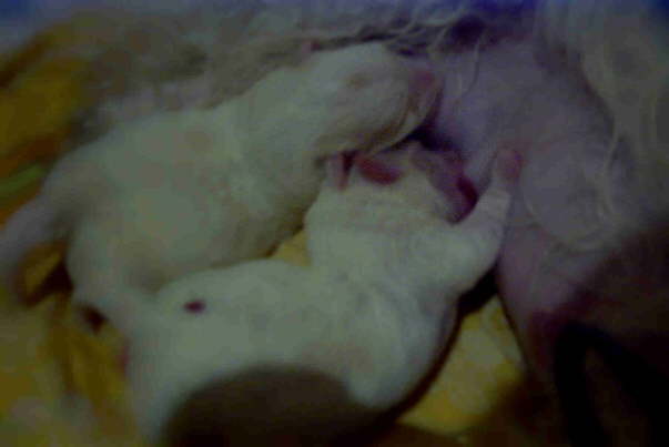 Aimée zeigt es uns: Dierote Zunge fest an derZitze und rhythmisch und kräftig gedrückt. Eigentlich mehr ein Melken als ein Saugen.Mit den Vorderläufen der "Milchtritt", mit den Hinter-läufen kräftig abgestützt!